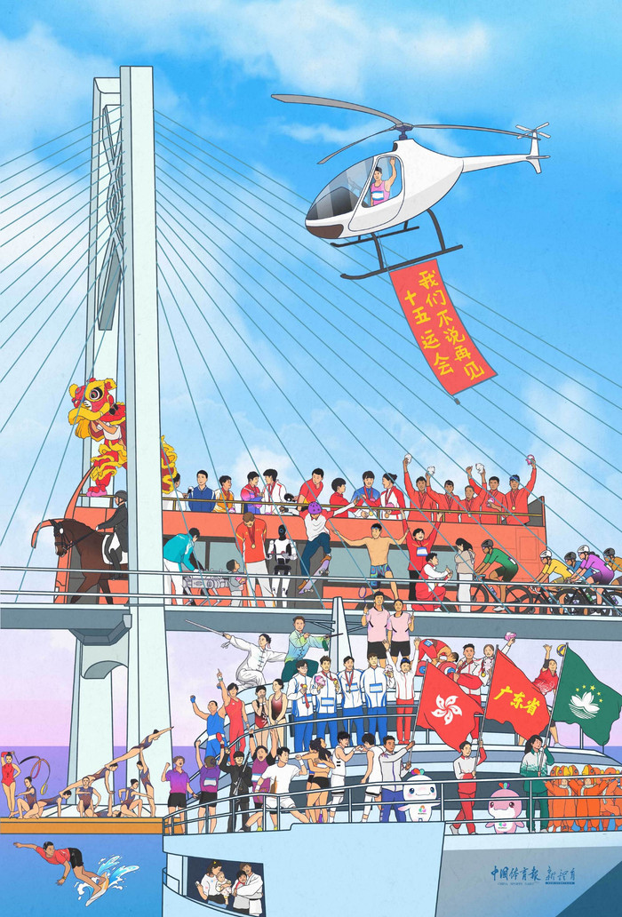 《一图绘不尽十五运的故事与温度》发布于第十五届全运会闭幕当天,以手绘形式,全景式呈现首次由粤港澳三地联合承办的综合性体育盛会的精彩图景。手绘场景融合运动员赛场拼搏、温情互动,以及赛事举办期间的文化交融与湾区风貌。作品不仅定格了体育竞技的激情与魅力,更传递出超越胜负、同心协作的人文温度,让体育精神与湾区情谊在画卷中交相辉映、绵延不息。